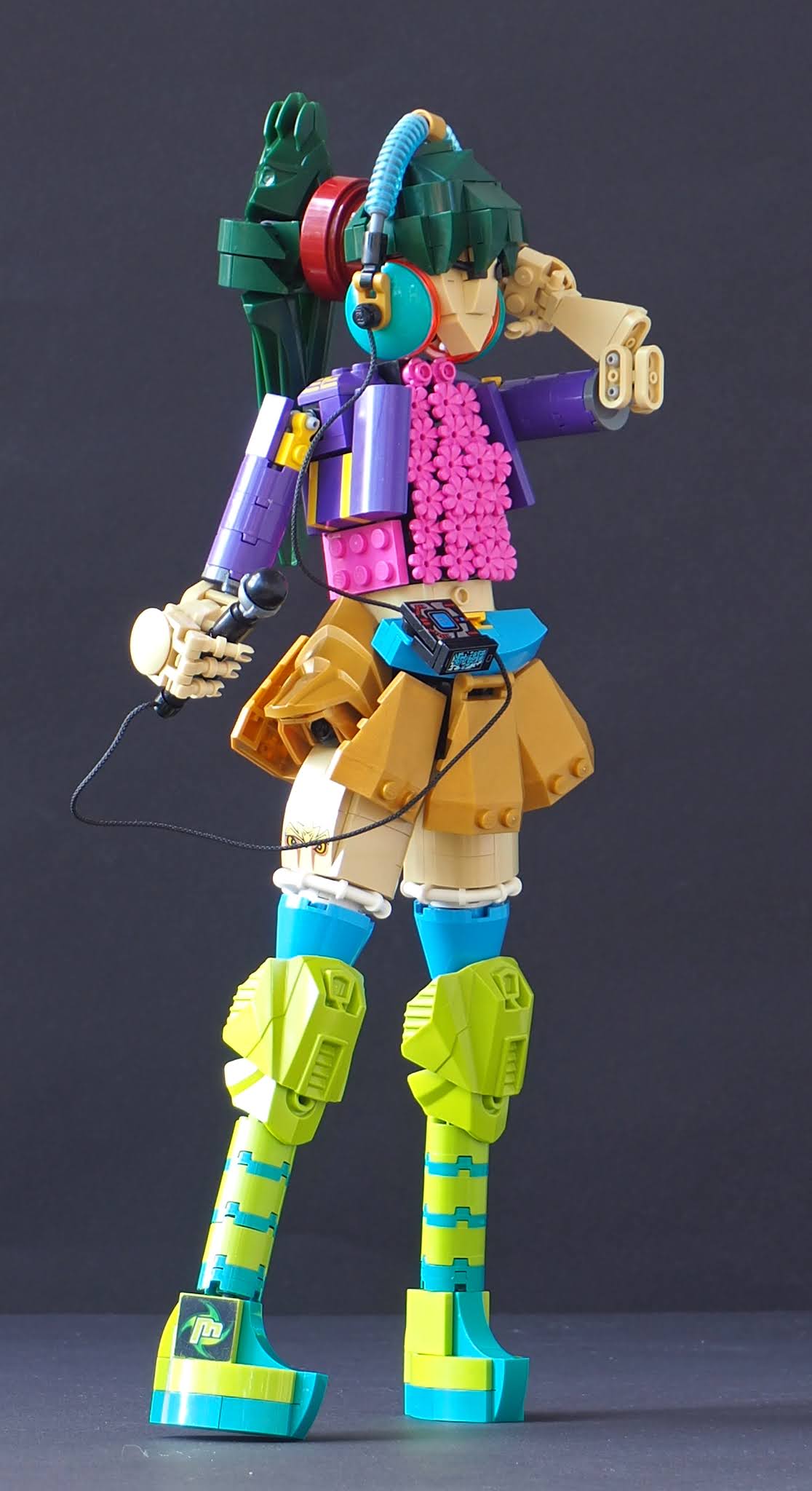The first part I actually built was the hair, which uses dark green "ski" Bionicle feet from Karzahni, known as great Bionicle parts pack. They are accompanied again with cut-out corner 1x2 curved slopes that form short side bangs. There's also a vibrant pair of earphones, essential part of journalist's gear. The back of the head is somewhat flat, and I used lot of time trying to solve it, but making it bigger made the ponytail point too far to the back. Those Bionicle feet require substantial space for connection, and I wanted to have a heavy band (dark red is used) dividing the hair. Fortunately the earphones hide the flatness on most angles.