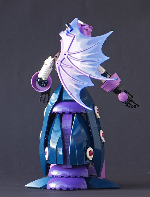 I'm happy with the stomach area shaping especially, and layering of fabrics turned out nice. Choice of emitting legs for long, ornamental dress was quite late, and fuelled by lack of parts in right colour for legs. It made the process nicely unique compared to usual figures, but left me wondering if I should have gone bit less baroque with the dress shaping, especially the part with clam shells. The just were, along with medium lavender barrel halves, marbled purple dragon wings and that printed magic portal 4x4 dish, on a mental list of parts I want to use somewhere. The round shapes all around are complemented with trans-pink jewels inside life saver rings, decorations I'm happy with.Colour scheme seems to fit January's pleasantly cold weather nicely. The name is, of course, reference to Monty Python's Tim the Enchanter. And yes, she's got a third eye too.