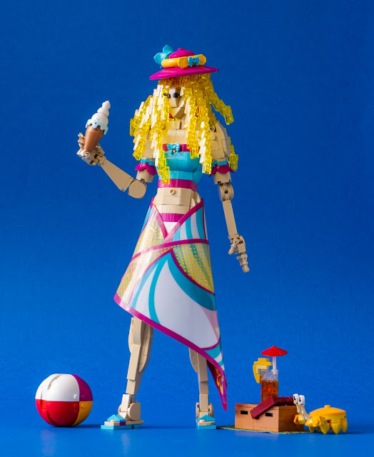 In addition to the clothes, I packed in the MOC some extra beach gear; a box of picnic, a refreshing drick, beach-almost-ball, an ice cream cone (must-have!) and a crab. The crab is a reference to those crab collabs cool people do. The crab befriends Bea in the end.