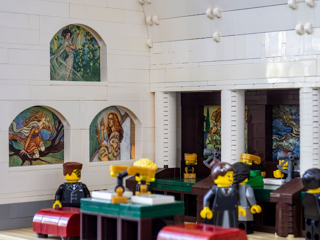 The frescoes of the bankin hall are not Lego so this is not purist work (gasp!). Our LUG's contest rules allow up to 1 % non-Lego-stuff in entries, and this one uses seven Magic the Gathering cards, illustrated by Rebecca Guay, much-adored artist of vintage Magic. Her work is very fitting for this jugendstil/Art Nouveau period, reminding of Alphonso Mucha or even Tampere-based Joseph Alanen. There cards - Samite Blessing, Sky Spirit, Dwell on the Past, Pulse of Llanowar, Quirion Trailblazer, Devout Harpist and Calming Verse - vary from unplayable to relative weak; but every one of them have beautiful art and I believe they work better here than in any of my decks. The art is almost exactly 6 studs wide, which made the integration very easy. The cards were not harmed during the build, they're simply contained inside the walls.