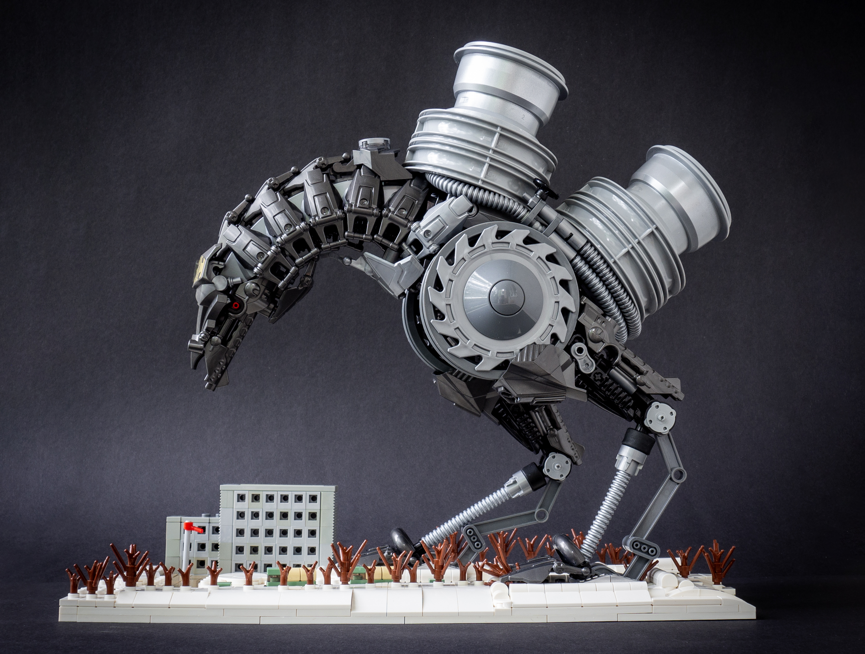 This is my entry to Bio-Cup 2024's first round, with the theme of energy - nuclear. Only a couple of days before the reveal of the theme I had wondered how to use some of large wheel/hub pieces I have around; my prelim entry used the coolest of them, the wholly metallic silver 90s concept hubs. This uses large F1 hubs with the Harley-Davidson hubs (from New Elementary's 2019 Parts Festival) to make the two large nuclear reactors on the construct's back. In general terms, this stayed quite similar to the initial concept. I imagines a two-legged machine striding over a landscape, a nuclear reactor hanging on its back. In the end, I doubled the reactors and turned them pointing slightly backwards - in my three small sketches, made in a train during a day trip to Helsinki it was angled frontwards like a rugsack on a hunchback's back.